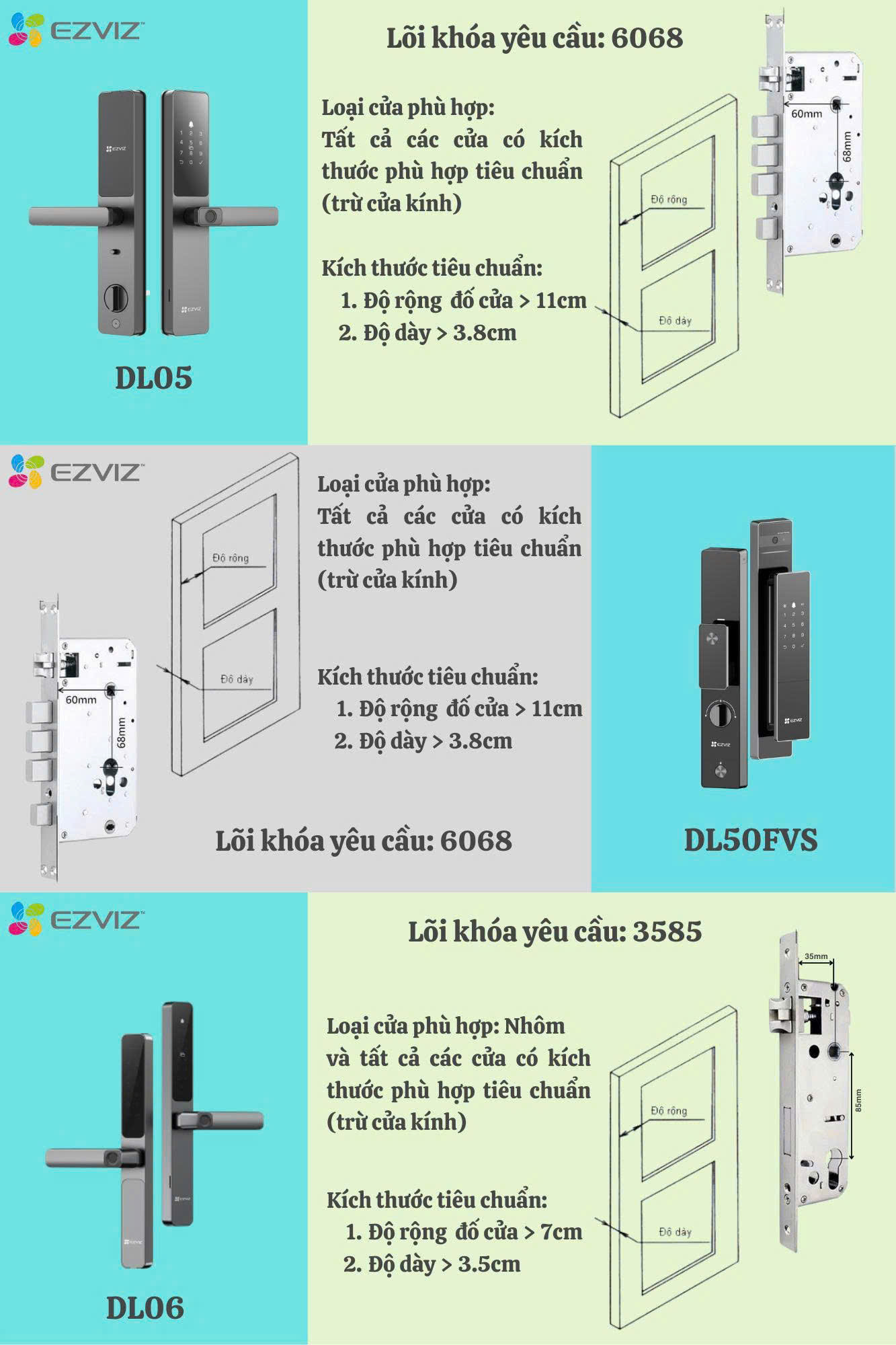 | Phù hợp cửa | Mortise cho cửa dày 40–60 mm | Backset phổ biến 60/70 mm |